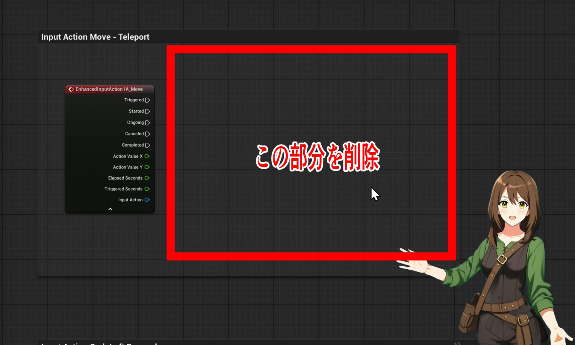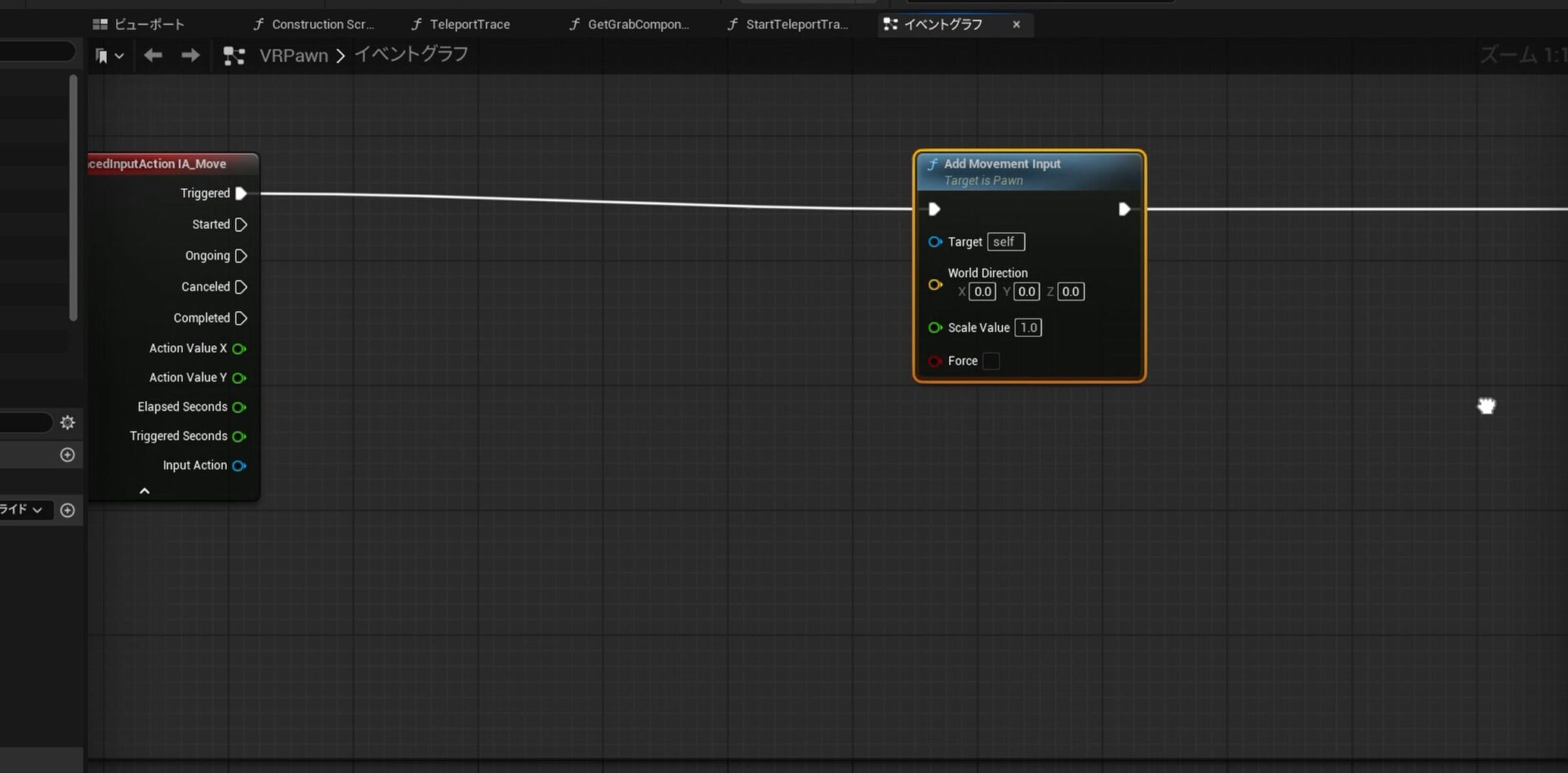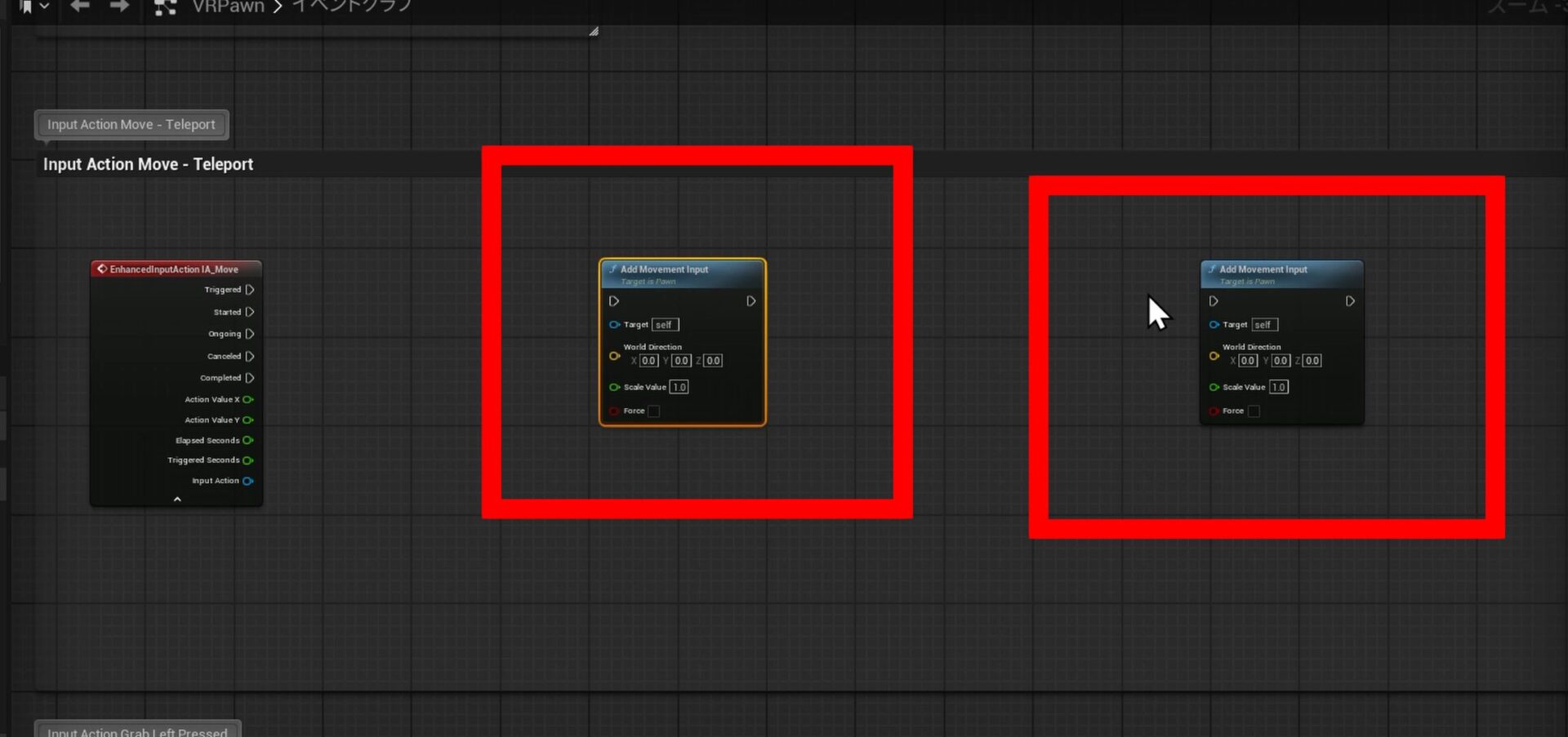 古い魔法を封印する もしくは 改造 :テンプレートには既にテレポート用の処理が書かれています。(Input Action Move)今回はこれが邪魔になる可能性があるため、残したい場合は、テレポート関連のノードの接続を切り、項目を選択してコピーして画面の左、または右側に塊を置いて保存しておきましょう。