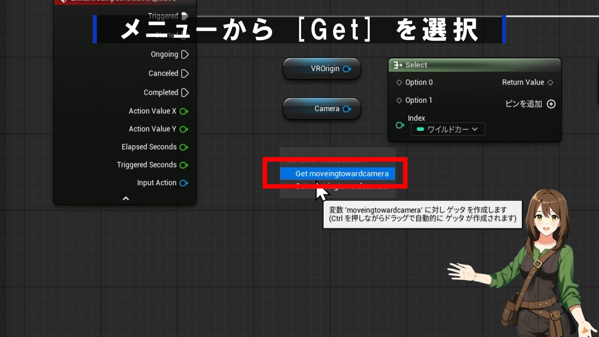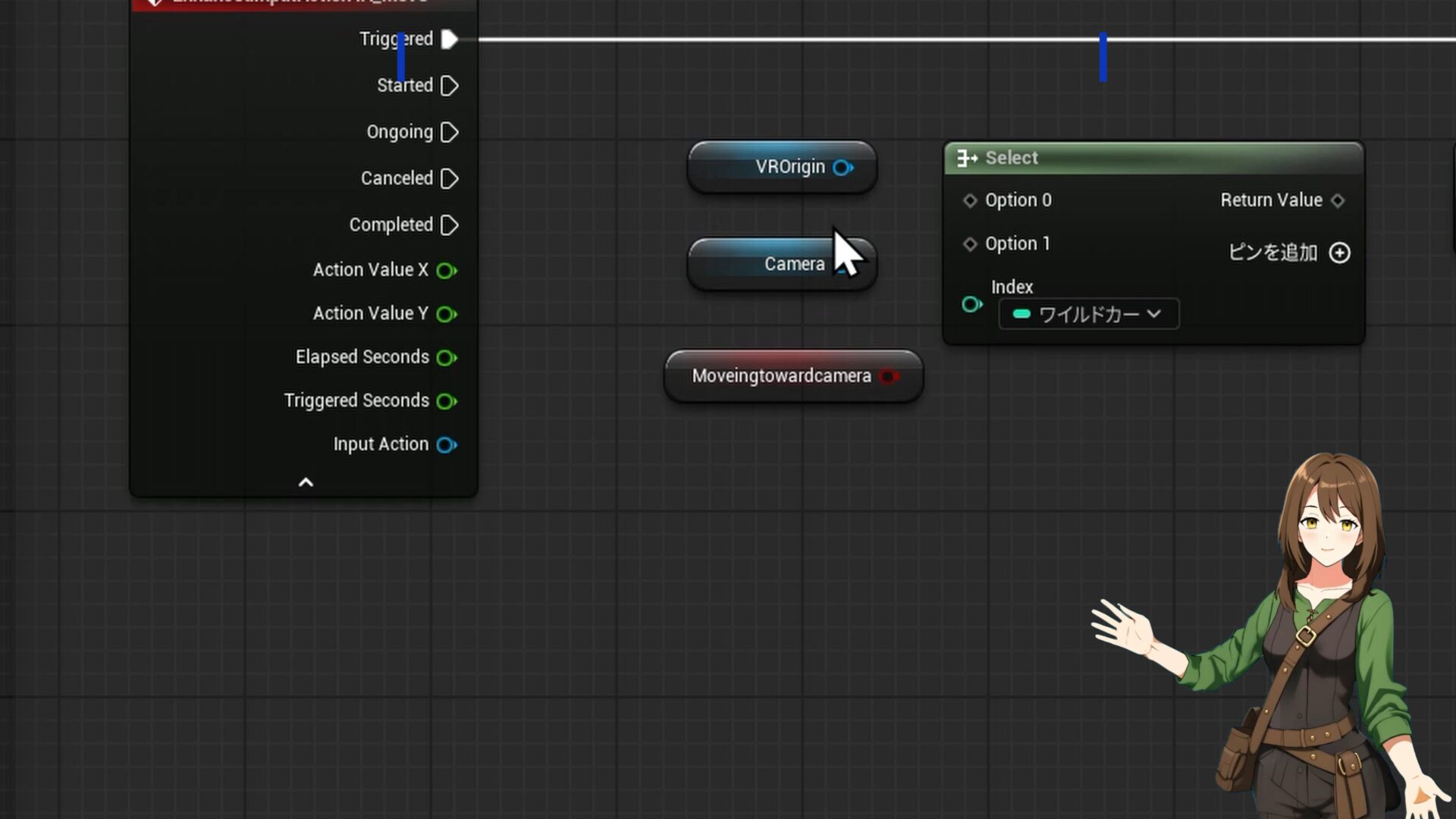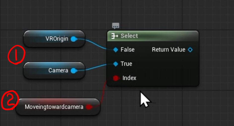 - Selectノード: 作成した「Select」ノードと、先ほどの変数(MovingTowardCamera)をIndexに繋ぎます。