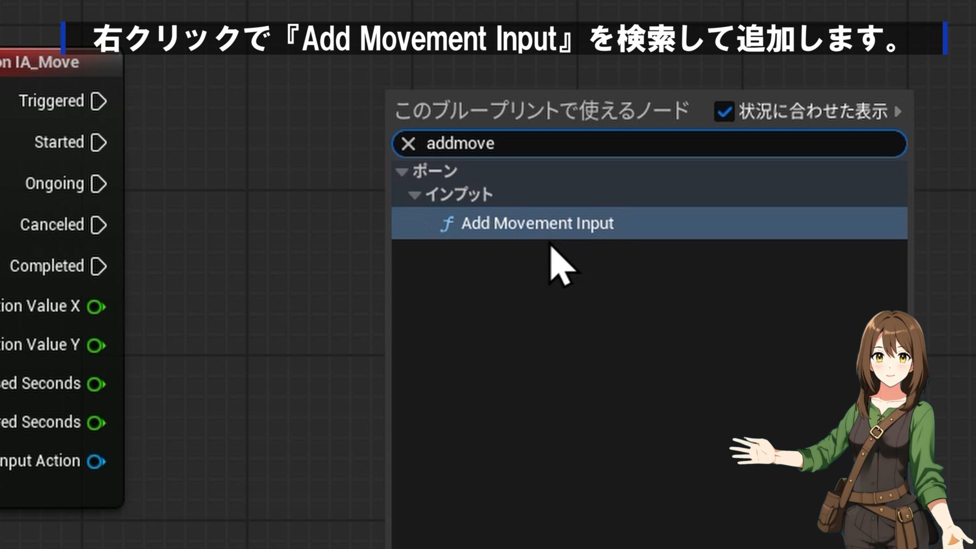 右クリックをして検索窓でIA_Moveと検索すれば項目が出てくると思いますのでクリックして配置しましょう!