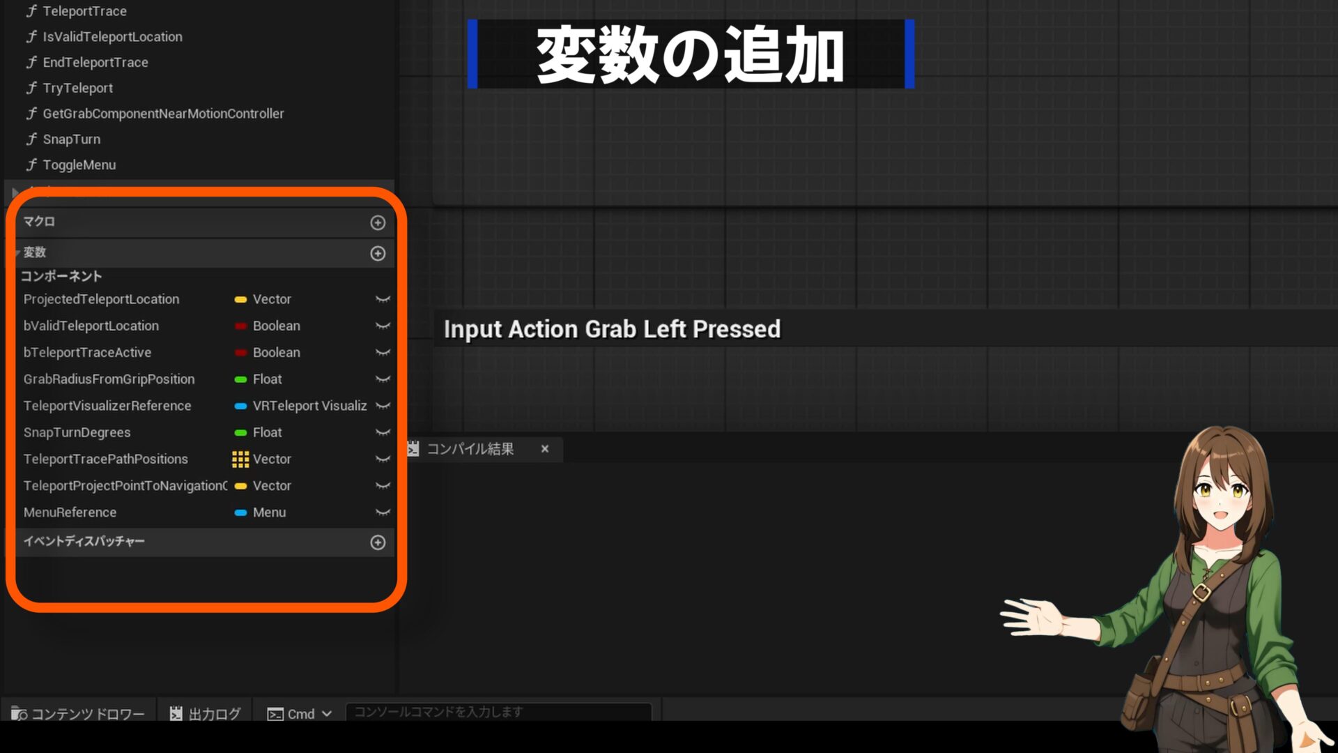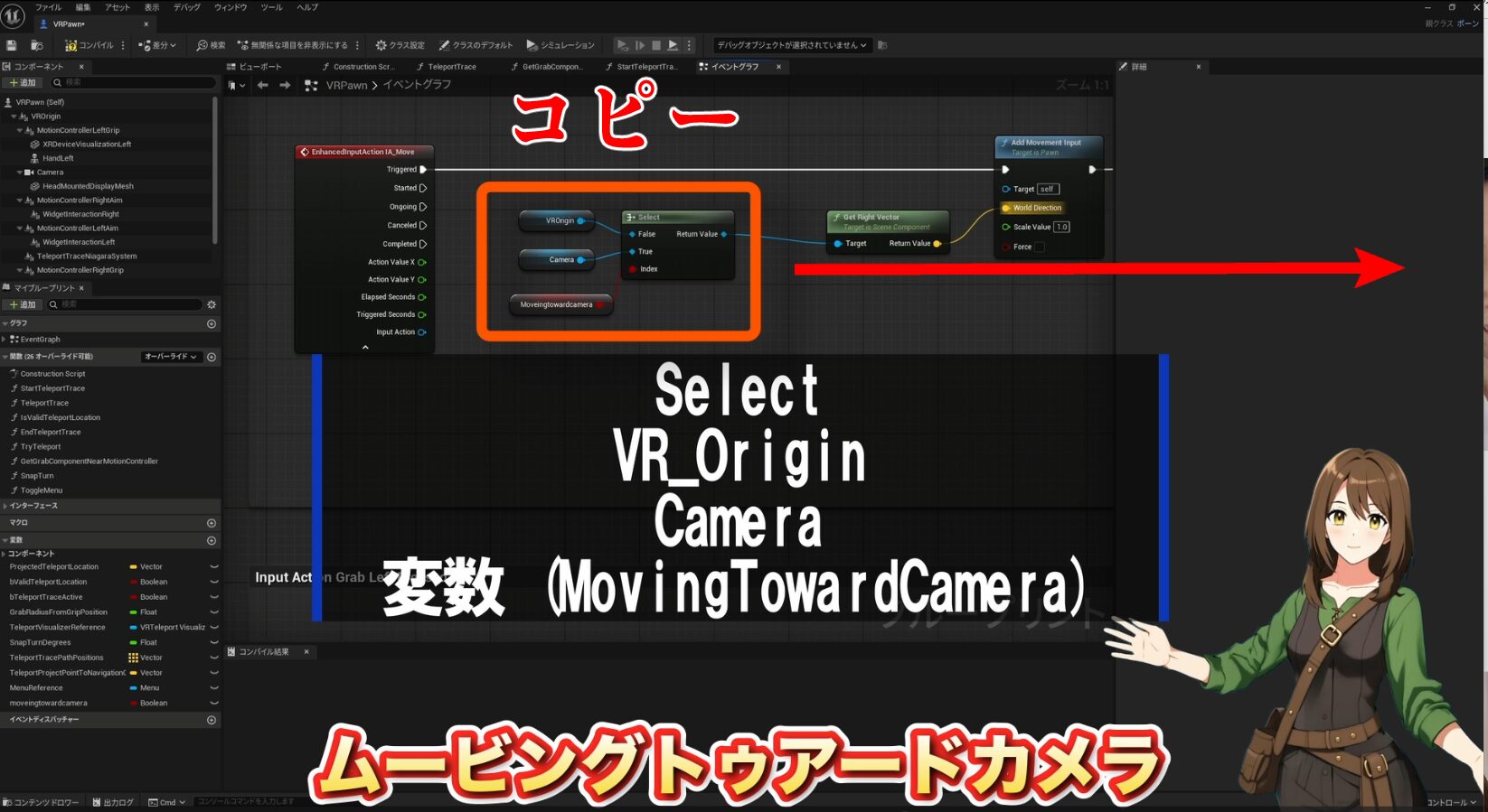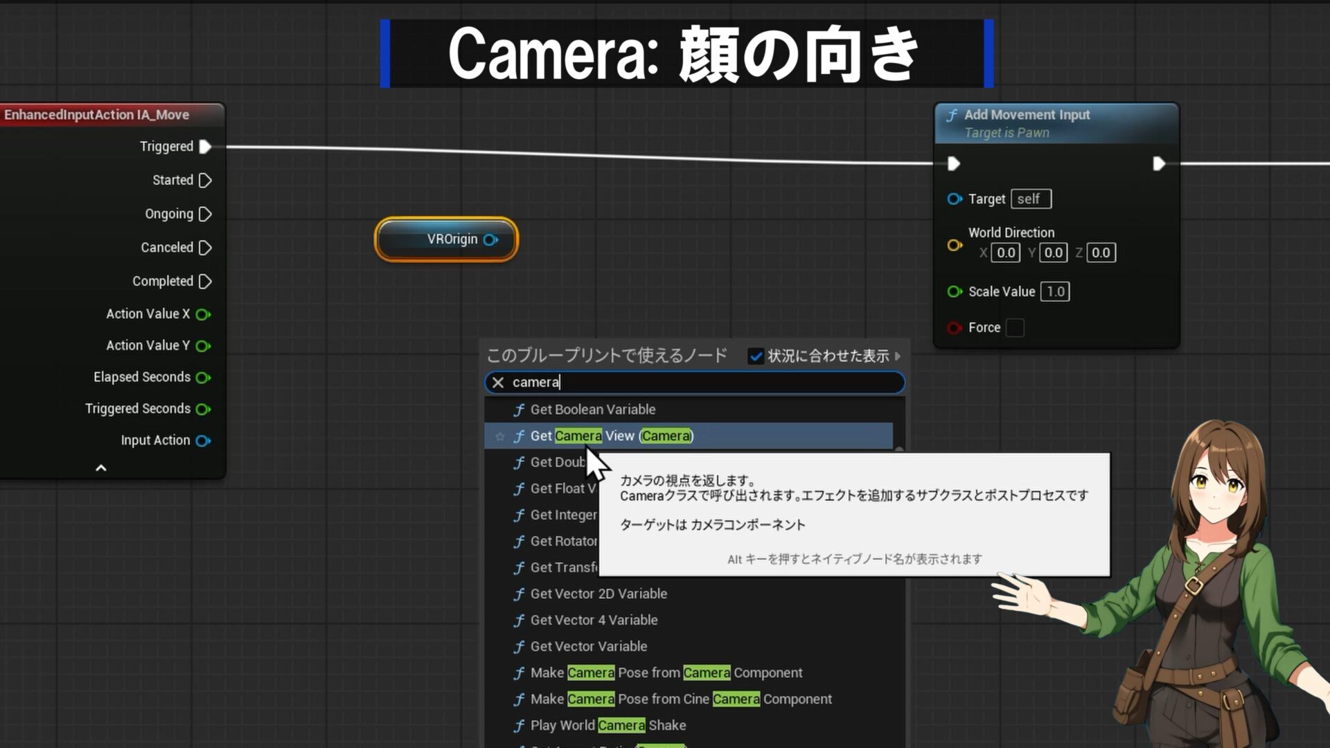 - 変数の作成: ここで一つ工夫をします。カメラの向いている方向(顔の向き)に進むか、コントローラーの向きに進むかを切り替えられるようにします。