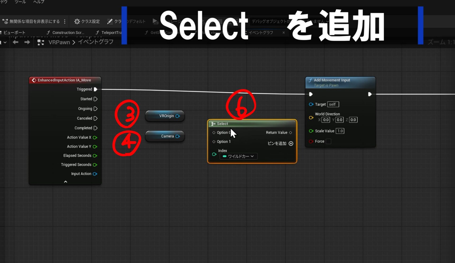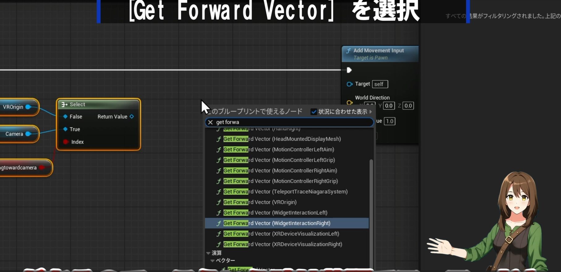 ② ⑴select から Get Right Vectorに接続 ⑵更に左右用のAdd Movement Inputの「World Direction」に繋ぎます