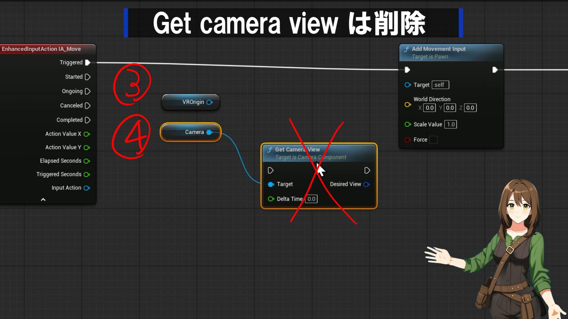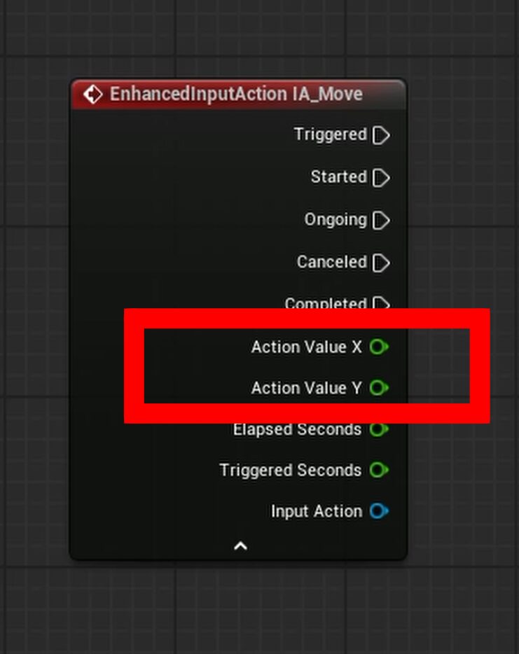 ① 左右の動き(X軸)の接続 まず、IA Moveノードにある**「Action Value X(緑色のピン)」から線を伸ばします。