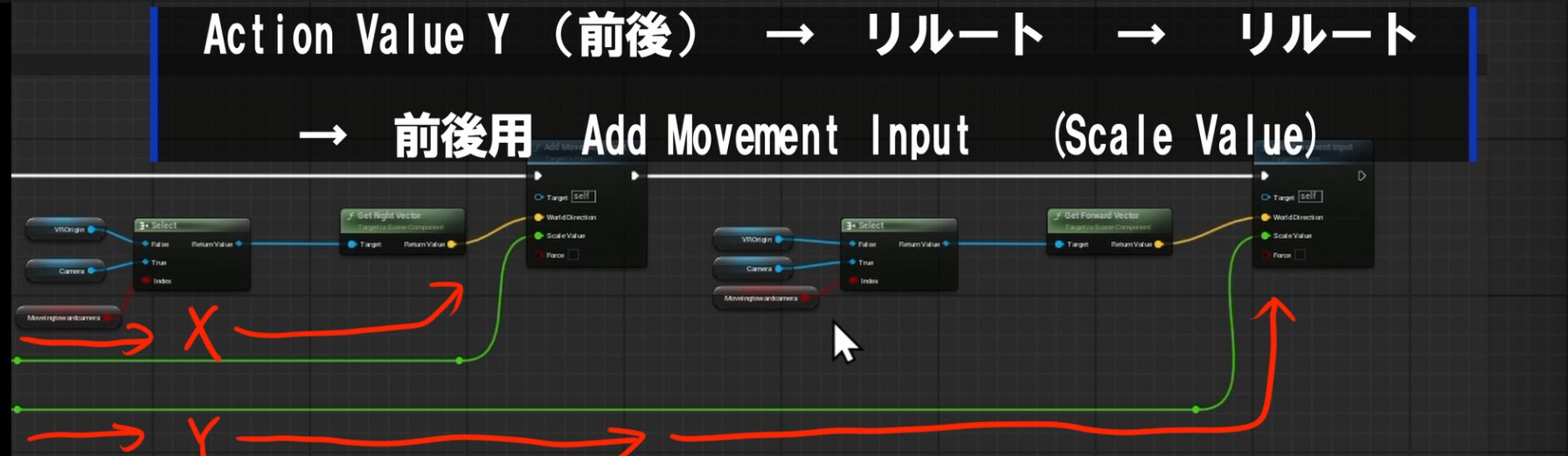 ③ 前後の動き(Y軸)の接続 次に、**「Action Value Y」から線を伸ばし、同様にリルートノードを経由させて、前後移動用のAdd Movement Inputにある「Scale Value」**に繋ぎます。
