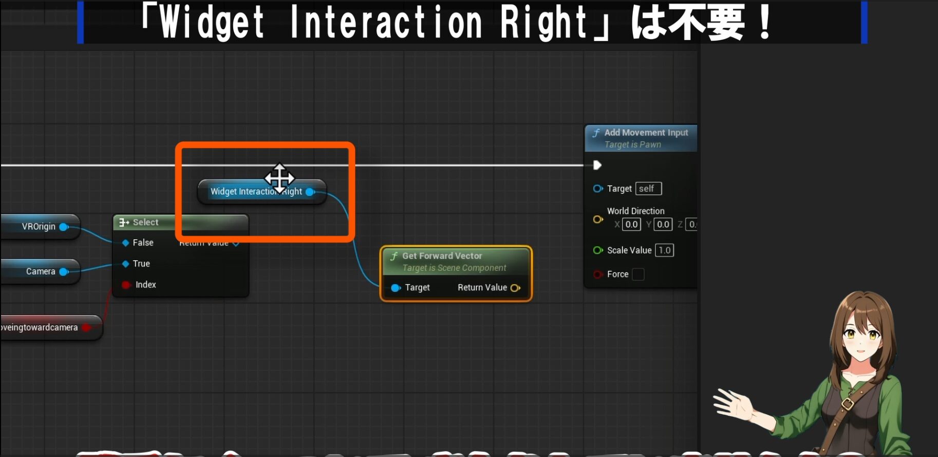 ② 先ほど置いたリルートノードを経由させて、左右移動用のAdd Movement Inputにある「Scale Value」**に繋ぎます。