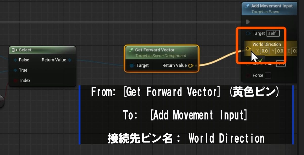 Get Forward Vectorに接続⑵更に左右用のAdd Movement Inputの「World Direction」に繋ぎます。