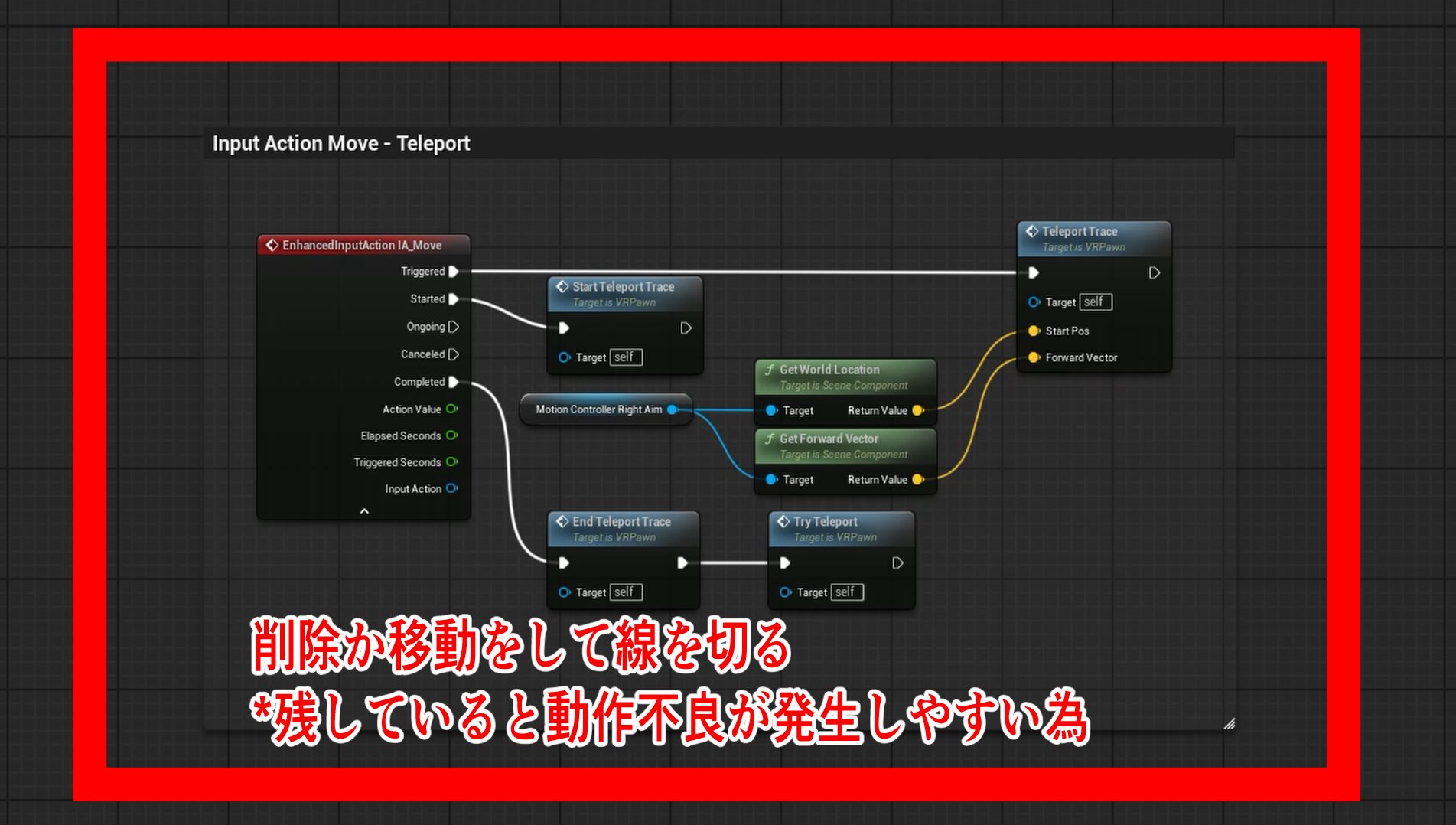 古い魔法を封印する もしくは 改造 :テンプレートには既にテレポート用の処理が書かれています。(Input Action Move)今回はこれが邪魔になる可能性があるため、残したい場合は、テレポート関連のノードの接続を切り、項目を選択してコピーして画面の左、または右側に塊を置いて保存しておきましょう。