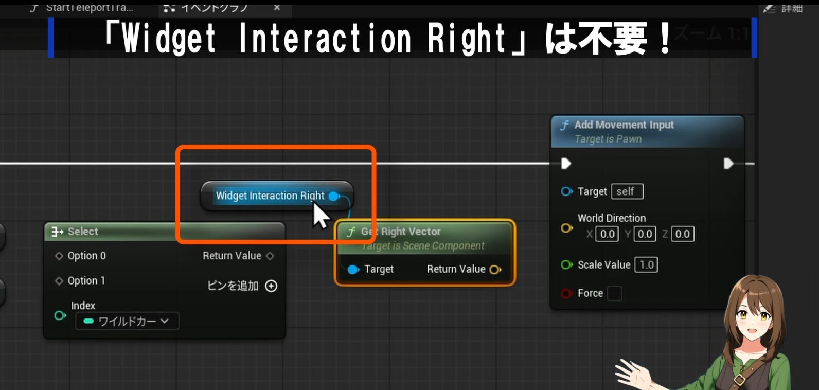 ② 先ほど置いたリルートノードを経由させて、左右移動用のAdd Movement Inputにある「Scale Value」**に繋ぎます。