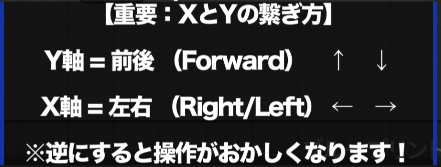 もしこれを逆に繋いでしまうと、「前に進もうとしたのに、カニ歩きで横にスライドする」という奇妙な呪いにかかってしまいます。まずはこの**「Y=前後」「X=左右」**という鉄の掟を心に刻んでください。