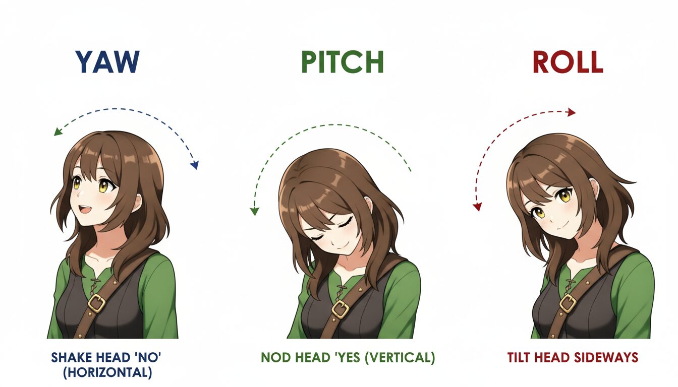 ゲーム開発、特に3D空間では、回転を表すためにこの3つの言葉が必ず出てきます。難しく考えず、「首の動き」で覚えてしまいましょう。