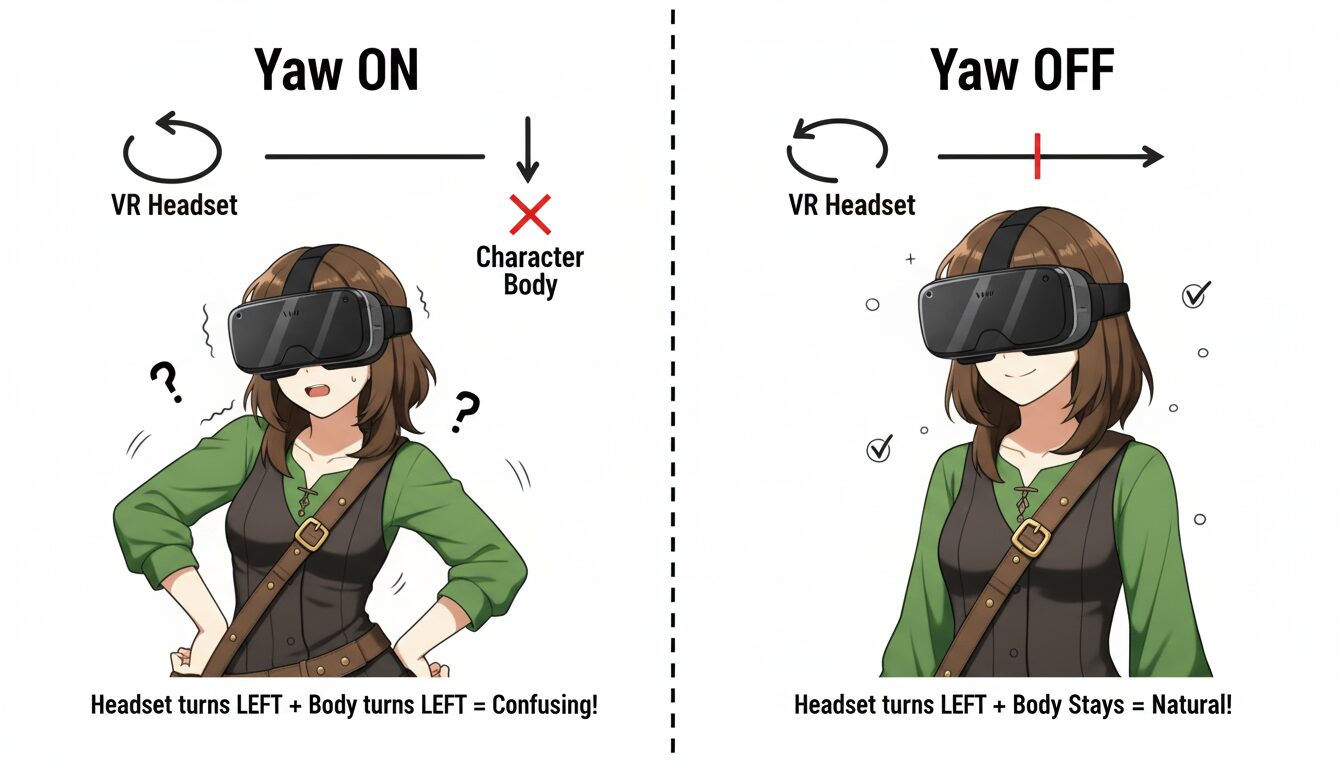 この記事は、そんな「専門用語アレルギー」のあなたのための「翻訳書」です。 この記事を読み終える頃には、あなたは「Yaw」の呪文を完全に理解し、VR酔いを引き起こさない快適なキャラクター設定を、自信を持って行えるようになっています。