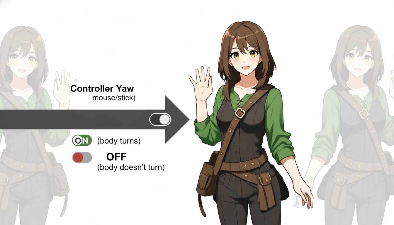 「Use Controller Rotation Yaw」をOFFにすることは、「頭(視点)の動き」と「体(キャラクター)の動き」をあえて分離させるために必要な、重要な設定なのです。 これにより、開発者はプレイヤーが酔わないように、体の回転方法を意図的にコントロールできるようになります。